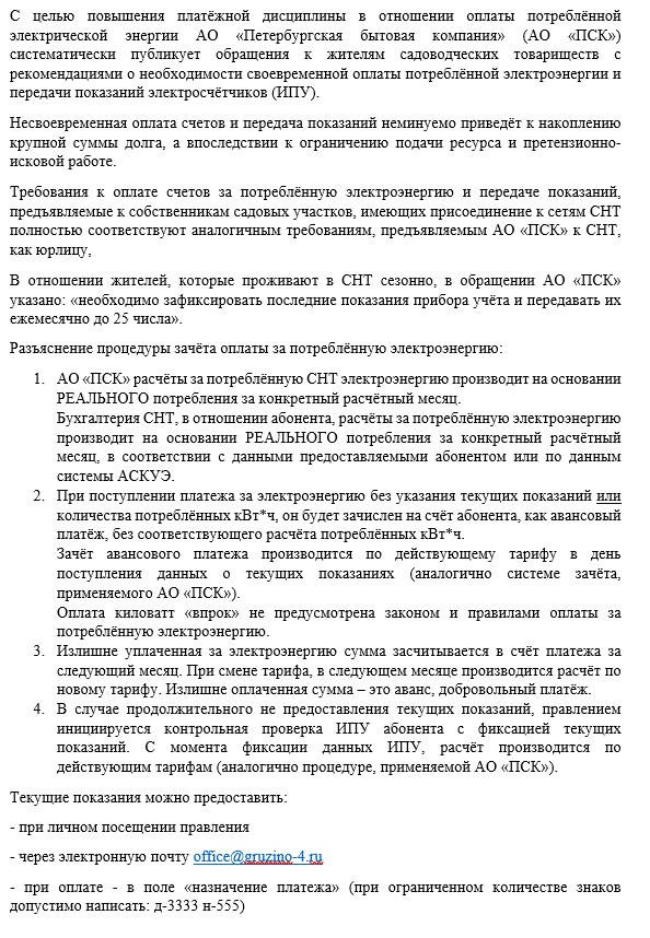 - Получатель платежа: СНТ «Садоводство "Грузино-4"»